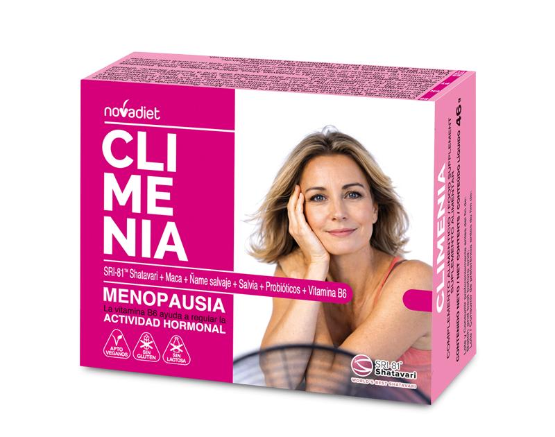 El Climenia de Nova Diet es un complemento alimenticio formulado para ayudar a aliviar los síntomas asociados a la menopausia. Contribuye a equilibrar los cambios hormonales propios de esta etapa, ayudando a reducir molestias como sofocos, sudoración, cambios de humor, cansancio o ansiedad.
